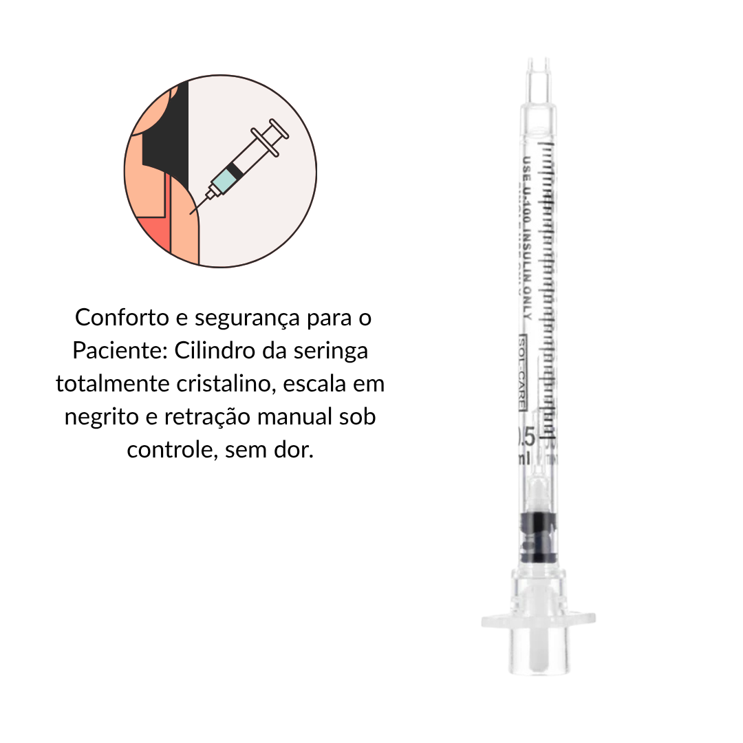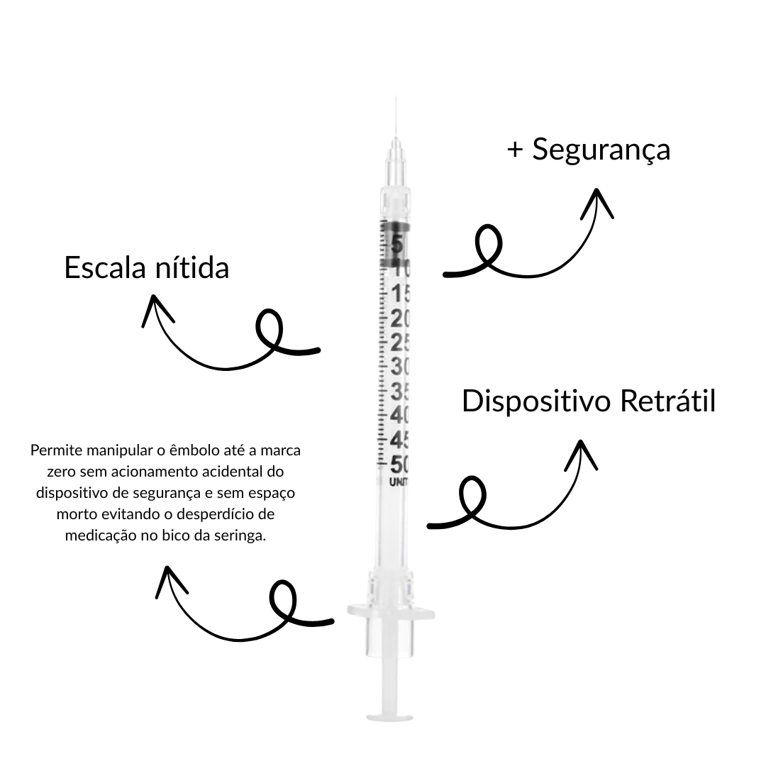 A Seringa de Insulina possui agulha fixa conforme recomendação do Manual da Sociedade Brasileira de Diabetes (2022). Facilita a aspiração das unidades ímpares pois a sua escala é de 1 em 1 UI. Anel de retenção evita vazamento, contaminação e retirada do êmbolo. Perfeito deslize do êmbolo. Economiza em média 6 unidades de insulina por aplicação quando comparada a uma seringa com agulha removível.